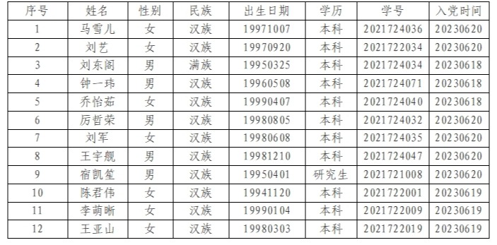 在听取党员、群众意见的基础上,经支部委员会审查,拟将马雪儿等12名同志转为中共正式党员。根据发展党员工作有关要求,现将其有关情况进行公示。