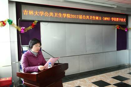 流行病学与卫生统计学教研室博士生导师俞琼副教授,作为教师代表讲话,对全体学位获得者寄予了殷切的希望;姚广明同学代表全体学位获得者发言,表达了同学对母校、对授业恩师的深深感激以及努力将掌握的知识学以致用的信心。最后,李娟院长发表了热情洋溢的讲话,向获得公共卫生硕士(MPH)专业学位的同学们致以热烈的祝贺,向为培养他们而付出心血的老师们表示衷心的感谢和崇高的敬意。