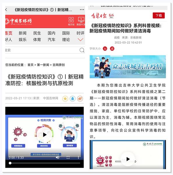 科普视频共分为六期,向社会公众宣传了核酸检测与抗原检测、清洁消毒、公共场所和社区疫情防控、疫情期间膳食指导和心理健康指导等疫情防控相关知识。视频兼具专业性和科普性,既深入浅出,又通俗易懂,在学院公众号一经发布,立刻引发了社会各界的广泛关注,更是得到了业界的一致好评,吉林日报和中国吉林网等媒体相继进行了转载,并发布相关报道。