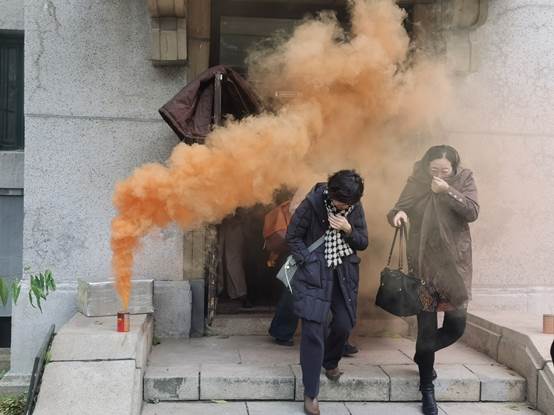 疏散逃生演练开始后,学院楼内响起火警警报,楼道释放模拟烟雾,参演师生立即按照学院消防应急预案,在保卫办工作人员的组织下,快速、安全、有序地从安全出口撤离至学院室外避难所。待全部人员集中在避难所后,安志成科长为师生演示了常用灭火器材二氧化碳灭火器和灭火毯的正确使用方法和注意事项。讲解后,参演师生进行了两种灭火器材的使用练习。