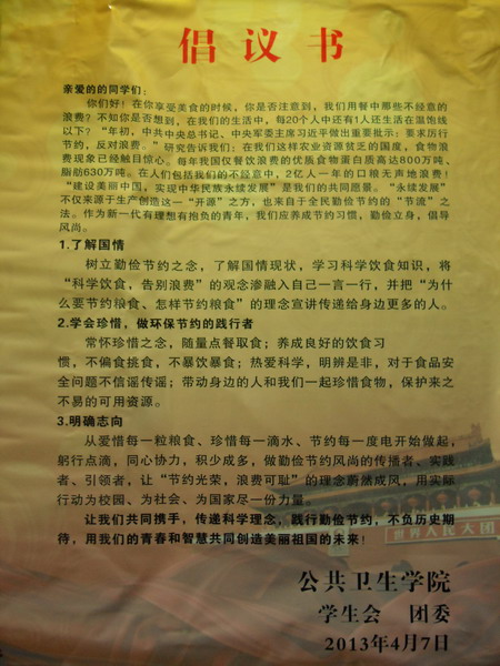 继动员会后,院学生会和团委共同发表了《厉行节约,从我做起》的倡议书,鼓励同学们践行“节约光荣,浪费可耻”的理念,肩负起当代大学生的青春使命,用实际行动为国家和社会尽一份力量!同时,学院利用校园广播、学院主页等阵地进行了广泛宣传。这一系列举措很快得到了师生的广泛响应。学院各年级陆续