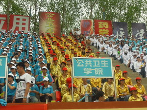 的参赛选手充分发扬“友谊第一,比赛第二”的体育道德精神,重在参与,积极参加了男子100米/1500米/5000米跑、跳绳、跳高、跳远、三级跳、时代列车等项目。金色的观众席上呐喊不断,一声声的加油助威是对运动员们最好的赞赏。值得一提的是,由12级全体同学表演的大型舞蹈《相亲相爱》恰到好处的诠释了“公卫人”相亲相爱和谐相处的精髓,带给了观众一场精妙绝伦的视觉盛宴;稳扎稳打的太极拳表演、行云流水的三路长拳表演不负众望,赢得了全场的热烈掌声和欢呼声。