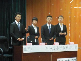 主持人宣布开始后,由双方辩友分别自我介绍,并简单展示本方观点;之后,有请评委上场。主持人宣布比赛规则和评分标准。紧张热烈的比赛随即开始,本场比赛共四个环节。在整场辩论过程当中, onejav
