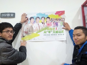 活动初期,在市疾控中心的协助下,志愿者们发挥自身专业所长制作写有预防艾滋病知识的宣传海报,以帮助全校更多非医学专业的同学了解艾滋、预防艾滋。宣传海报分别在中心校区李四光教学楼、逸夫教学楼、北苑一公寓、二公寓、三食堂、新食堂等张贴展出。海报一经贴出,便吸引不少的同学前来观看,“海报内容生动形象、通俗易懂,这种送健康知识进校园的活动我很喜欢”,一名同学如是说。志愿者们也在一旁耐心的解答同学们的疑惑。活动在一片欢乐祥和的气氛中画上了圆满的句号。