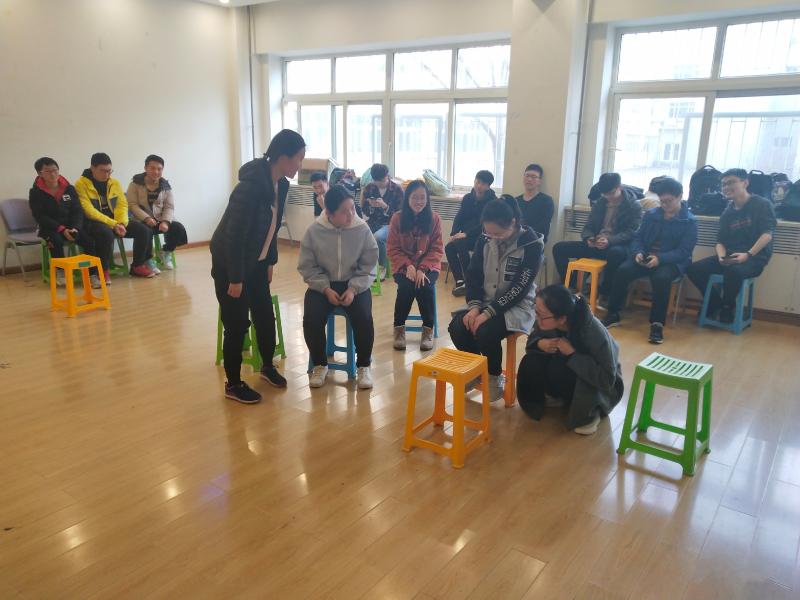 下午1点,同学们陆续到达教室并通过报数的方式分组坐好。第一个环节,通过让大家互相记住昵称并模仿对方设计的动作,来消解彼此间的陌生,现场气氛迅速变得融洽起来。随后,第二个环节,要求大家双手握拳,将拇指露出,用自身左手攥住右手拇指,每个人再攥住相邻右侧的人的拇指,大家手牵手、肩并肩,共同围成一个完整的圆。通过这个简单的游戏,同学们体会到了集体完成一件任务时每个个体在其中的重要性,也感受到了团结的力量。