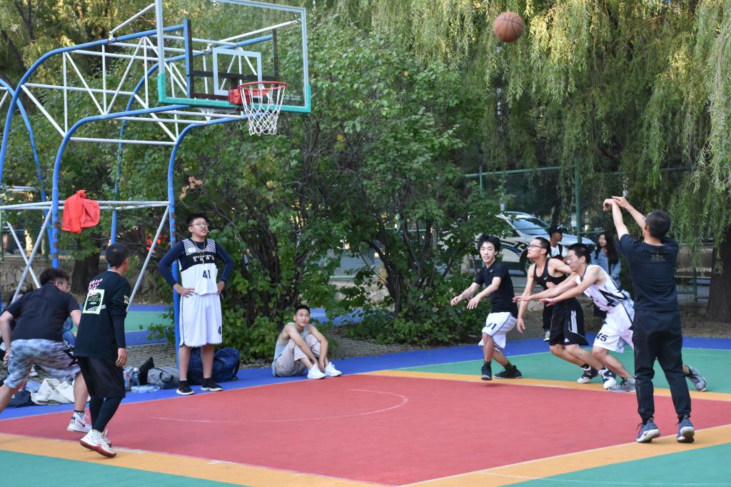 中心校区篮球场组织了2019级新生篮球赛。比赛双方分别是由2019级新生组成的新生联队和其他高年级同学组成的高年级联队。