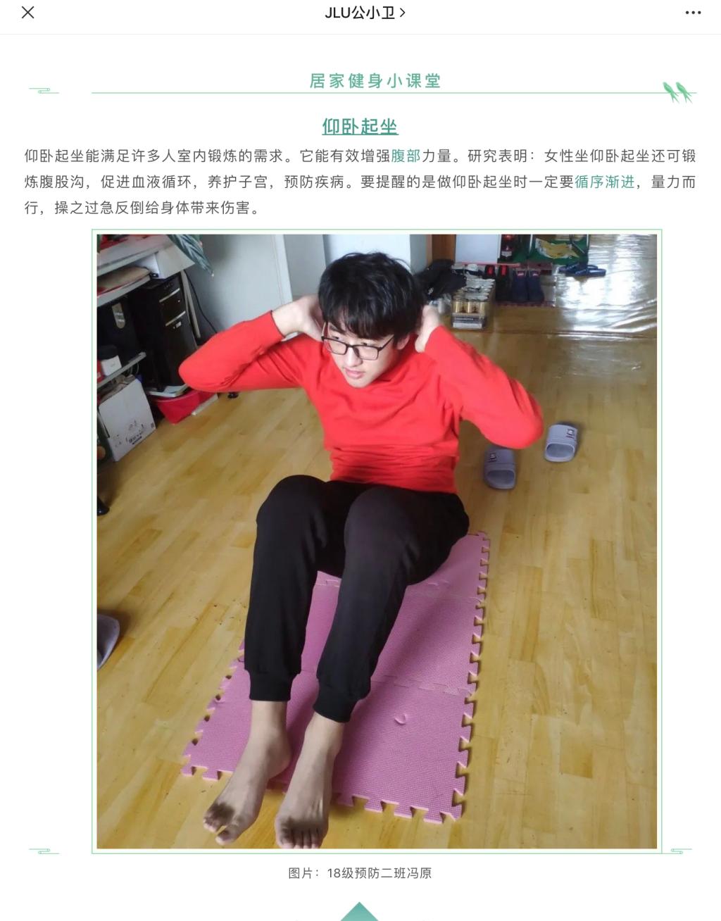 学生会体育部面向学院全体本科生开展了以“强身健体,抗击肺炎”为主题的居家健身活动。本次活动不仅以推文、照片和视频方式进行在线健身教学指导,也展现公卫健儿们别样的青春风采。