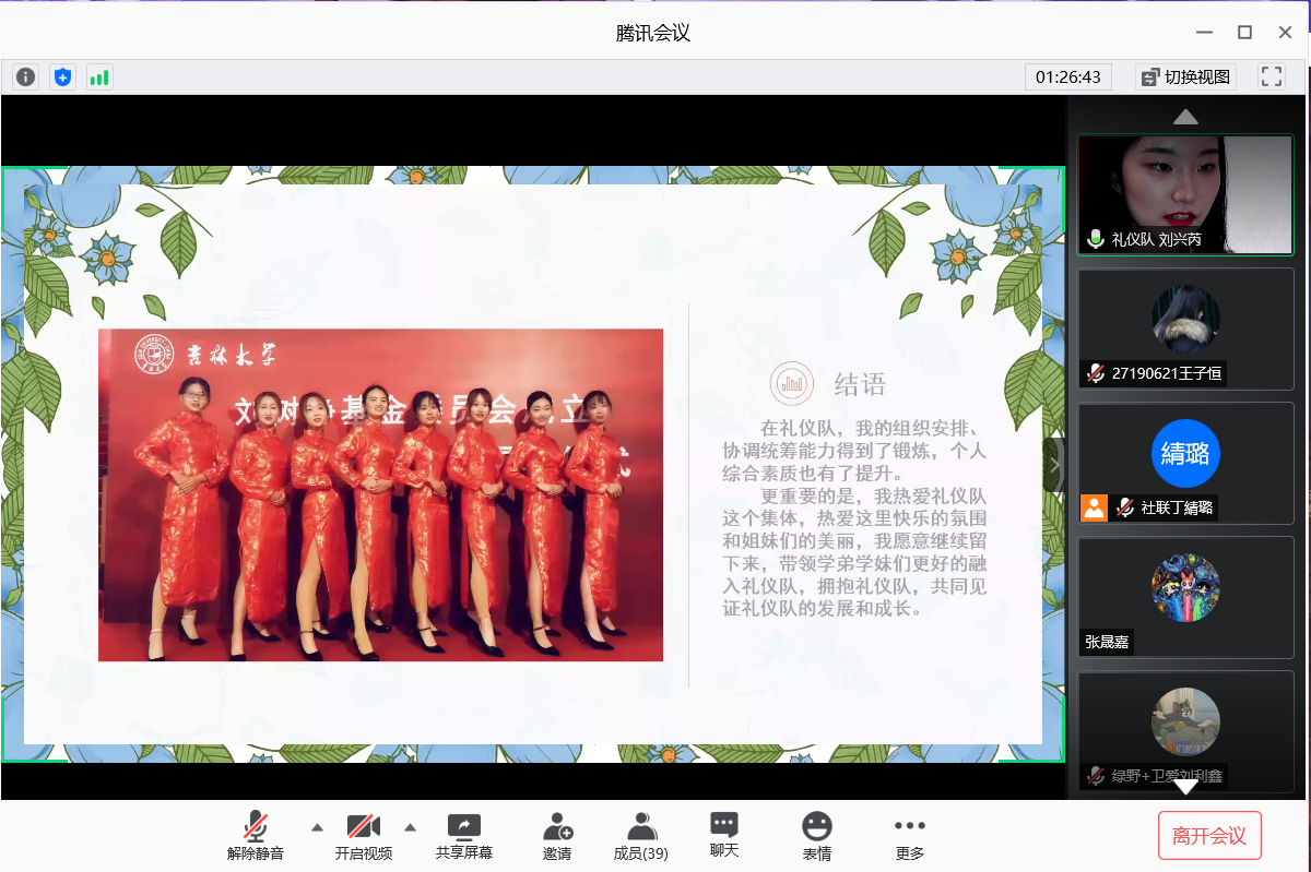 社团换届大会于6月24日晚六点在腾讯会议平台成功举行。2016级辅导员霍睿、2017级辅导员冷贺璇以及第36届团学组织成员出席本次会议。