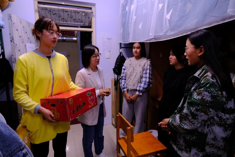9月30日晚,冷贺璇老师与导助们带着礼物来到新生寝室,逐一走访,为新生送上精心准备的月饼和苹果,以及中秋的祝福。月饼代表喜迎中秋,苹果寓意着平安顺遂。冷老师祝大家中秋节快乐,希望大家都能在未来的日子里平平安安。收到礼物和祝福的新生们纷纷对感谢老师表达了自己的感谢之情,并同样祝福老师中秋节快乐。接着,冷老师和新生们谈论各自家乡的情况,还聊起了同学们在初入大学这段时间里的点点滴滴,说到有趣的地方,大家都笑出了声。一时间整个宿舍洋溢着节日的欢乐。最后,老师叮嘱大家近日气温多变,要注意防寒保暖。同时严格遵守疫情防控要求,中秋假期期间不要随意外出,有问题或者需要帮助的时候可以随时与老师联系。这个中秋节虽然没有家人的陪伴,但是有学院和老师的陪伴,新生们也不再感到孤单。