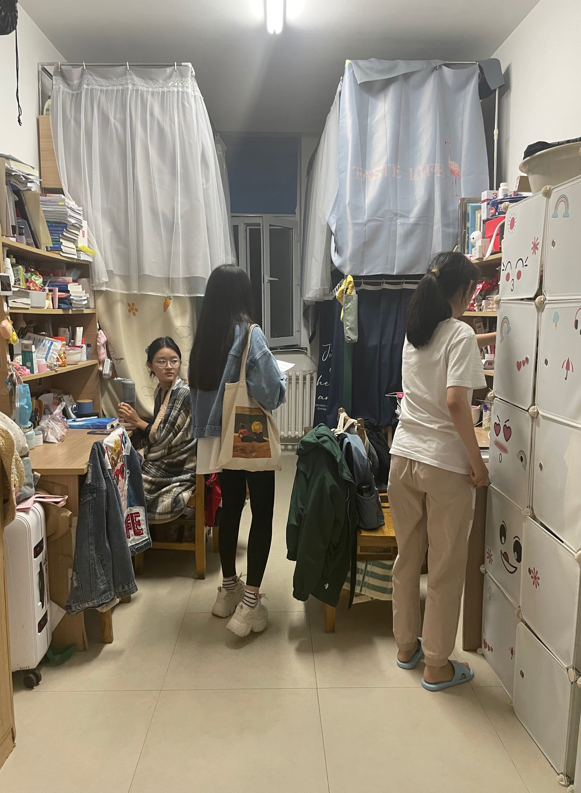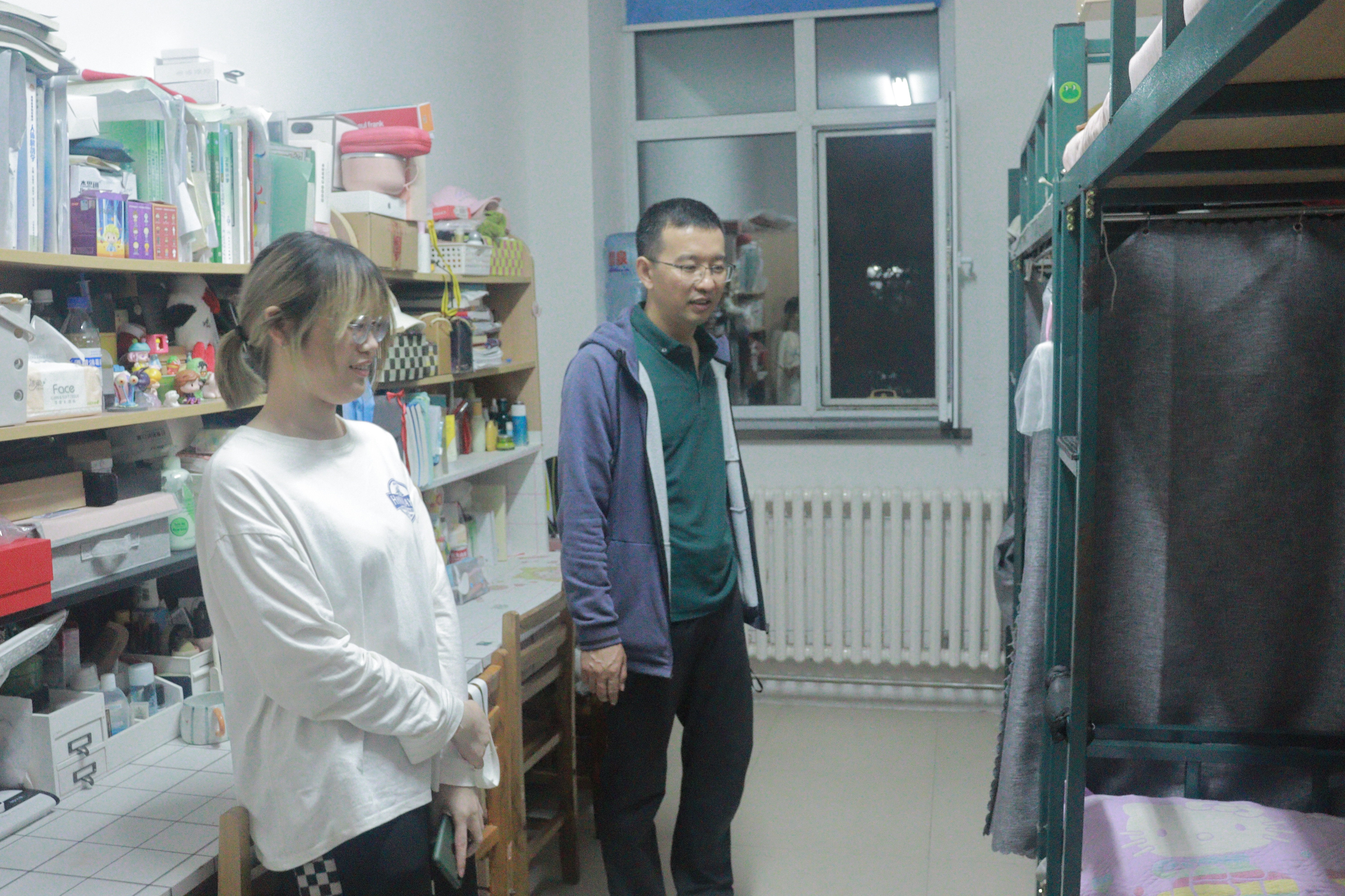 三位老师从十公寓开始,一个房间接着一个房间,询问同学们日常生活中遇到的问题并给予了生活建议,同时对寝室卫生进行检查,认真严谨中透露着和蔼可亲,柔声细语中又令人心生敬畏。每个寝室都十分整洁,被褥叠放整齐,杂物摆放规矩,无违规电器,受到了老师的极大表扬。检查之后,老师们叮嘱同学们一定要注意寝室安全,用电安全,禁止晚归,保持寝室的整洁。老师还特别鼓励了即将考研的同学们,让学生们信心倍增。
