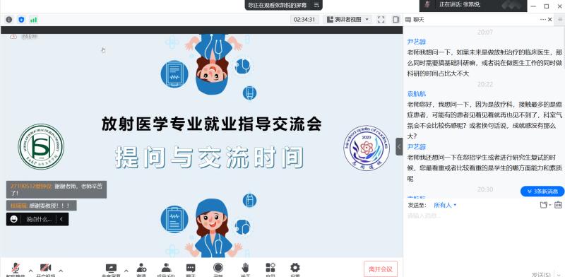 副院长寇长贵、党委副书记兼副院长刘金超、辅导员苏国范、冷贺璇和刘心怡几位老师,以及放射生物学教研室主任申延男教授作为主要与会人员来解答同学们的问题。