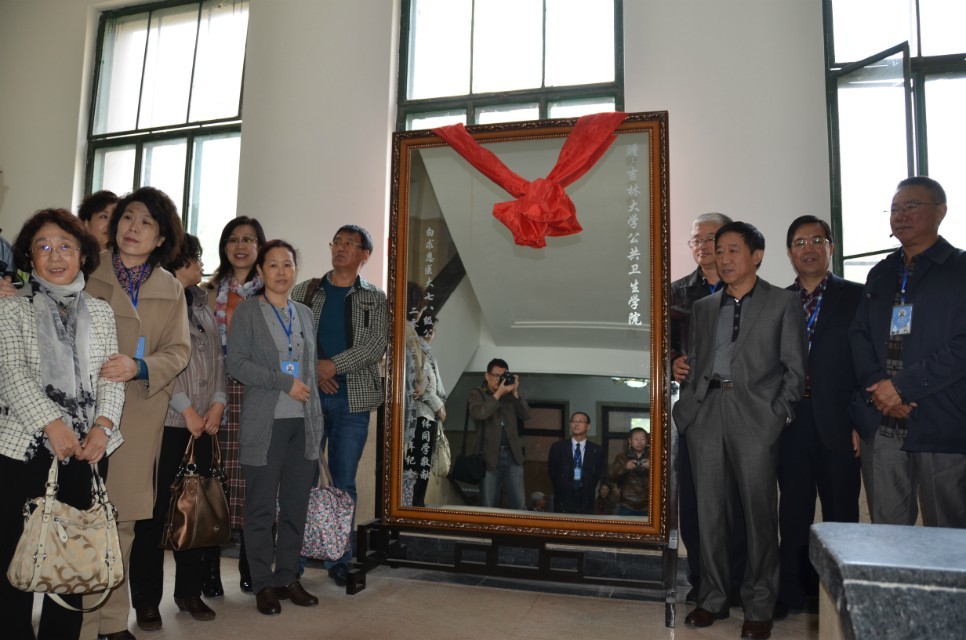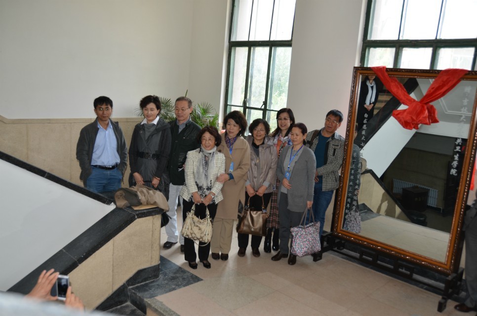 校友在教学楼门前合影留念