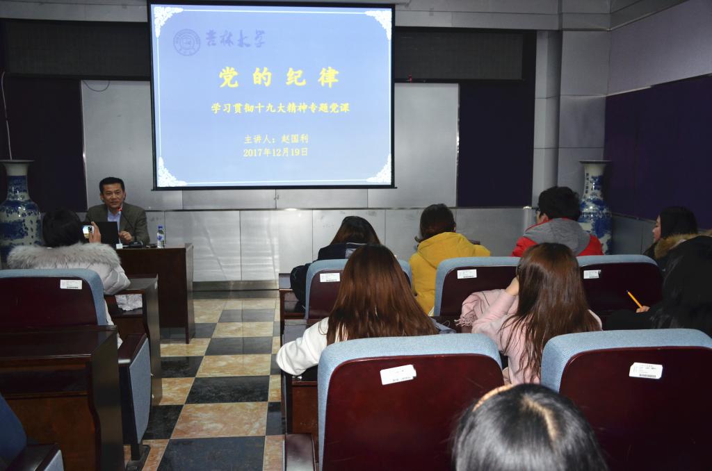 党委书记赵国利于新民校区学院三楼报告厅主讲了以“党的纪律”为主题的专题党课,2015级、2016级全体学生党员及学生干部参加了此次学习。