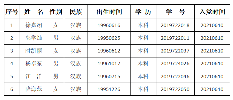 在听取党员、群众意见的基础上,经支部委员会审查,拟将徐嘉翊、郭学灿、时凯丽、杨卓东、汪洋、降海蕊6名同志转为中共正式党员。根据发展党员工作有关要求,现将其有关情况进行公示。