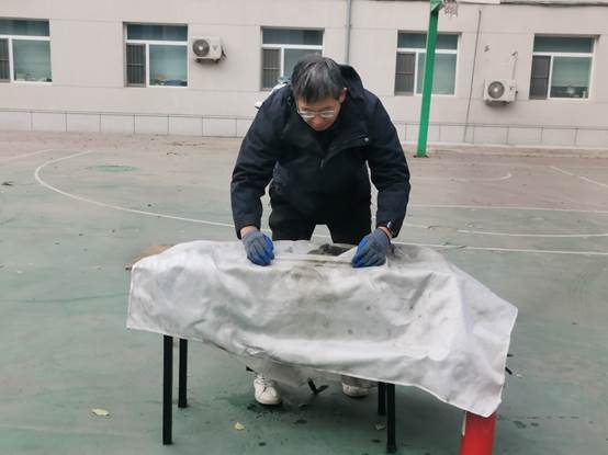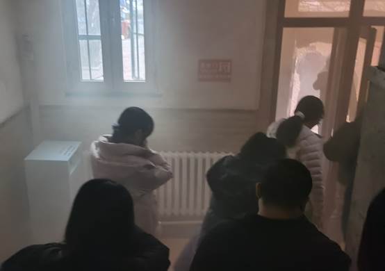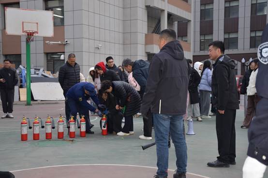 疏散逃生演练开始后,学院楼内响起火警警报,楼道释放模拟烟雾,参演师生立即按照学院消防应急预案,在保卫办工作人员的组织下,快速、安全、有序地从安全出口撤离至学院室外避难所。待全部人员集中在避难所后,安志成科长为师生演示了常用灭火器材二氧化碳灭火器和灭火毯的正确使用方法和注意事项。讲解后,参演师生进行了两种灭火器材的使用练习。
