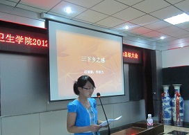 在学院三楼报告厅举行了2012年暑期“三下乡”社会实践活动总结大会,学院学生工作办公室苏国范老师以及全体三下乡社会实践活动志愿者参加了此次总结大会。参与健康体检的各组同学代表在总结会上发表了精彩的发言,农安之行一组的志愿者由2011级预防二班的杨艳荣以及庞博同学代表发言,他们感情真挚,表达了自己对这次活动的感激与不舍,畅谈了自己在下乡过程的感动与成长。
