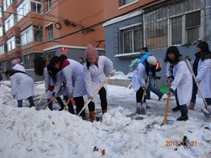 首先,由社区负责人带领志愿者们拿好铁铲、扫帚等铲雪扫雪工具,一起来到社区居民楼下,开始清扫活动。身着白大衣的 onejav