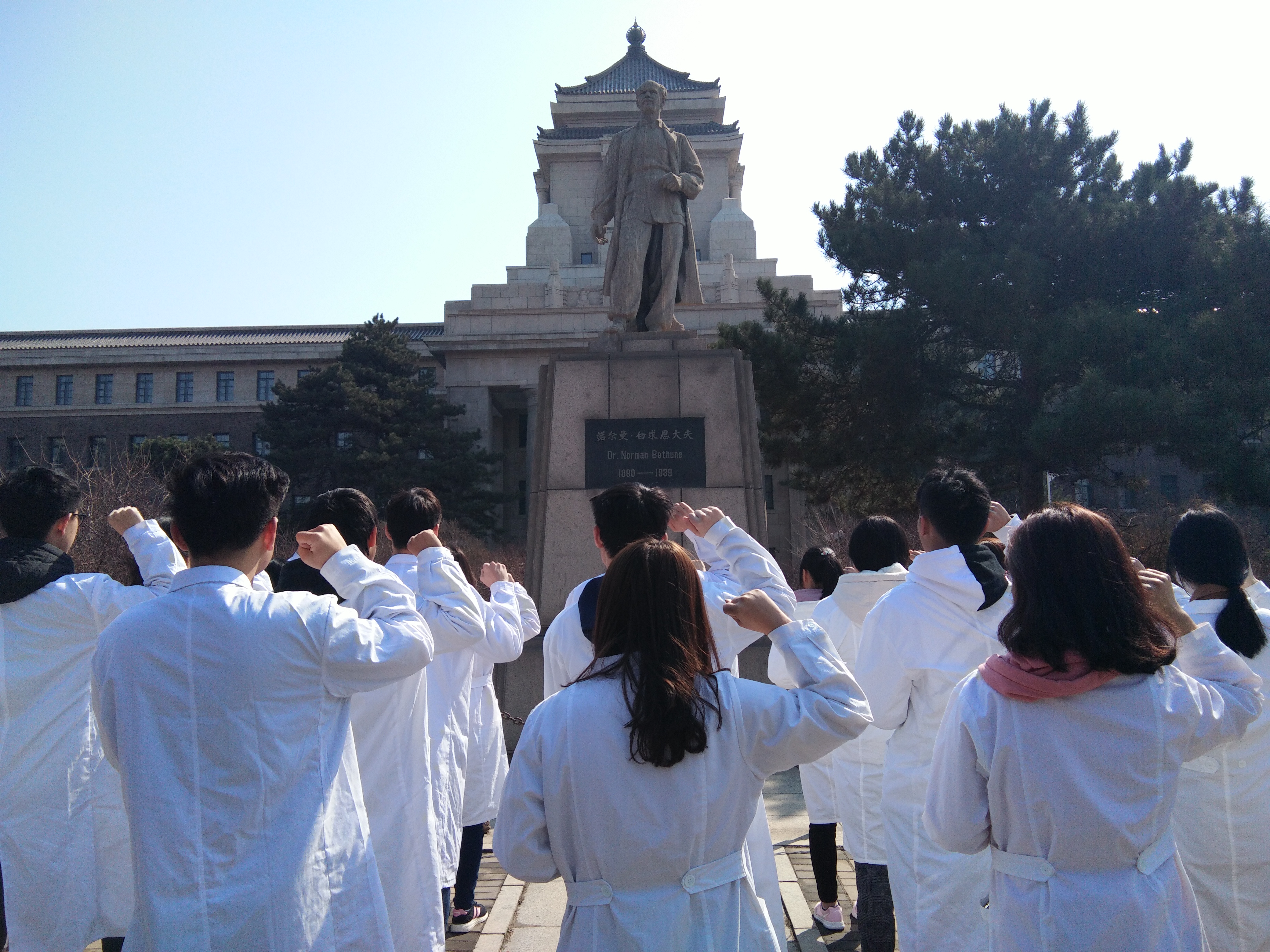上午9时,仪式正式开始。同学们身着白衣、手持红烛,庄严肃立于白求恩雕像前,举起右手放于耳畔,齐声宣读着《医学生誓言》:“健康所系,性命相托。当我步入神圣医学学府的时刻,谨庄严宣誓:我志愿献身医学,热爱祖国,忠于人民,恪守医德,尊师守纪,刻苦钻研,孜孜不倦,精益求精,全面发展。我决心竭尽全力除人类之病痛,助健康之完美,维护医术的圣洁和荣誉,救死扶伤,不辞艰辛,执着追求,为祖国医药卫生事业的发展和人类身心健康奋斗终生。”同学们在寒风中岿然不动,响亮而又坚定的声音回荡在新民校区白求恩雕像上空。