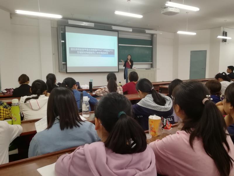 会议伊始,主持人向同学们介绍了主讲人情况,同学们满怀期待的眼神中流露出了对学长学姐的敬佩之情和对大创的浓厚兴趣。首先,由金晶介绍放射医学系的大创项目,她从放射生物学和放射化学的区别出发,以蛋白质精氨酸甲基化转移酶PRMT5甲基化P53在辐射诱导细胞死亡中作用的研究为例,从前期准备、开题、中期、结题四个重要时间节点详细讲述了完成大创项目的全过程。随后,何正卓介绍了预防医学系的大创项目,他就大创过程中的主要困难及其克服方法进行了详尽的阐述,他谈到做大创要选择感兴趣的项目,更要有对科研的热爱和坚持,半途而废或敷衍了事是无法做好大创项目的。最后,安凯介绍了医学信息学系的大创项目,他从自身的经历和经验出发,从寻找指导老师、组建团队、确定选题等方面给同学们提出了建议,并鼓励大家充分利用时间,在大创过程中积累经验,收获知识。三位主讲人精彩的讲解为同学们解答了疑惑,在同学们热烈的掌声中,此次大创经验交流会圆满结束。