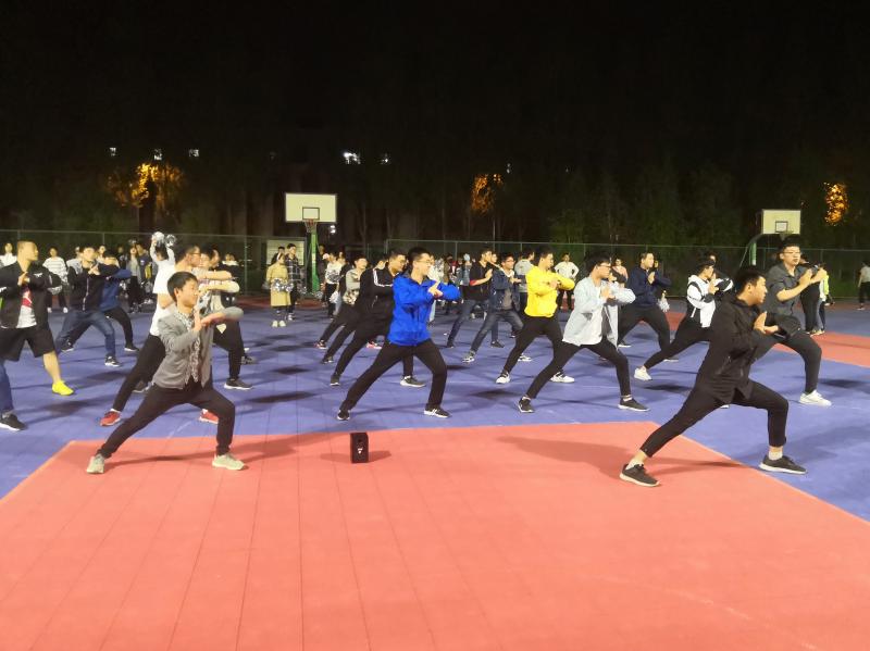 每晚九点整,32名男生准时来到集合地点开始训练。文艺部部员作为教练,耐心细致地讲解每一个动作要领,同学们仔细地聆听、认真地配合。随着一声声口号的起起落落,同学们凌乱的动作逐渐变得整齐划一,刚劲有力。大体训练过后,教练开始对每个同学的每个动作进行针对性指导,一次次的细心检查、一次次的耐心纠正、一次次的亲自示范,让同学们的动作质量得到了显著的提升。不积跬步无以至千里,不积小流无以成江河。训练接近尾声,再次合练时同学们步调一致,每一个动作皆有霹雷之势。同学们勤奋努力、团结奉献、刻苦训练的精神得到教练的认可和赞许,大家脸上都露出了欣慰的笑容。