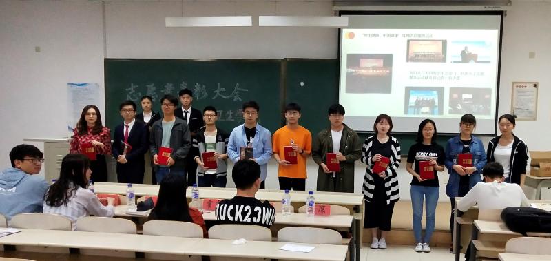 于5月31日晚六点半在中心校区李四光楼102教室举办了志愿者表彰大会。2016级、2017级辅导员霍睿出席了本次表彰大会。团委副书记金晶、团委常务副书记何正卓、学生会副主席车宏鑫、志工部部长闫森浩以及优秀志愿者代表们共同参与了本次活动。