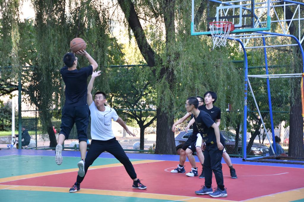 中心校区篮球场组织了2019级新生篮球赛。比赛双方分别是由2019级新生组成的新生联队和其他高年级同学组成的高年级联队。