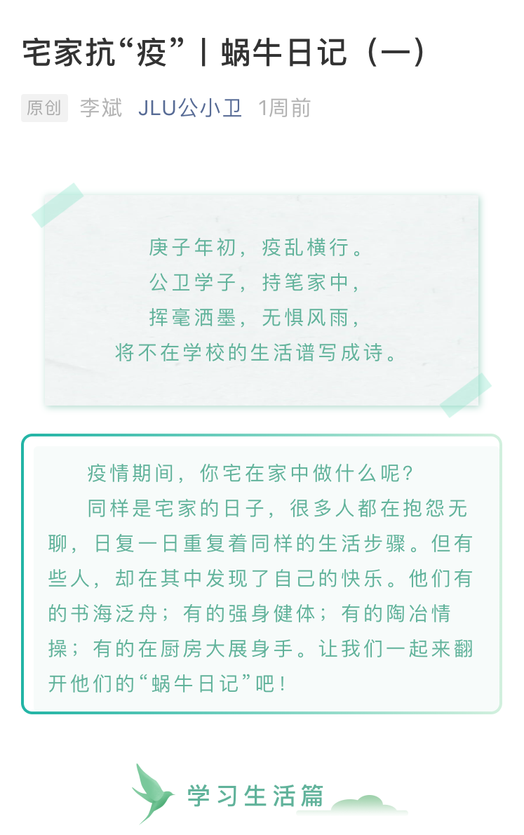 本次活动分为“居家日常”、“厨艺养成”、“学习生活”、“自我提升”、“社会实践”五个模板,报名的同学根据自己的喜好选择相应的模板提交作品。优秀作品在JLU公小卫平台推送中集中展示。2015级杨逸雪同学将她绣出的手帕展示给大家,一针一线下是对美好的期许;2016级何双双同学用阅读充实自己的生活,一书一文中是对思想的启迪;2017级万思雨同学正在为双学士论文而忙碌,柴昕宇同学开始了对新语言的学习;2018级万娟新同学不但学会了绣十字绣,还做出了美味可口的酱香饼,沈欣同学则拿起笔将大千世界描绘在了她的笔下;2019级陈叔阳同学心系高中生,利用空闲时间为他们解答疑惑、讲解试题,王涵同学则选择用尤克里里填补课业之余的空白……“蜗牛日记”仍在继续,相信它会带来更多同学们精彩有趣的生活风貌。