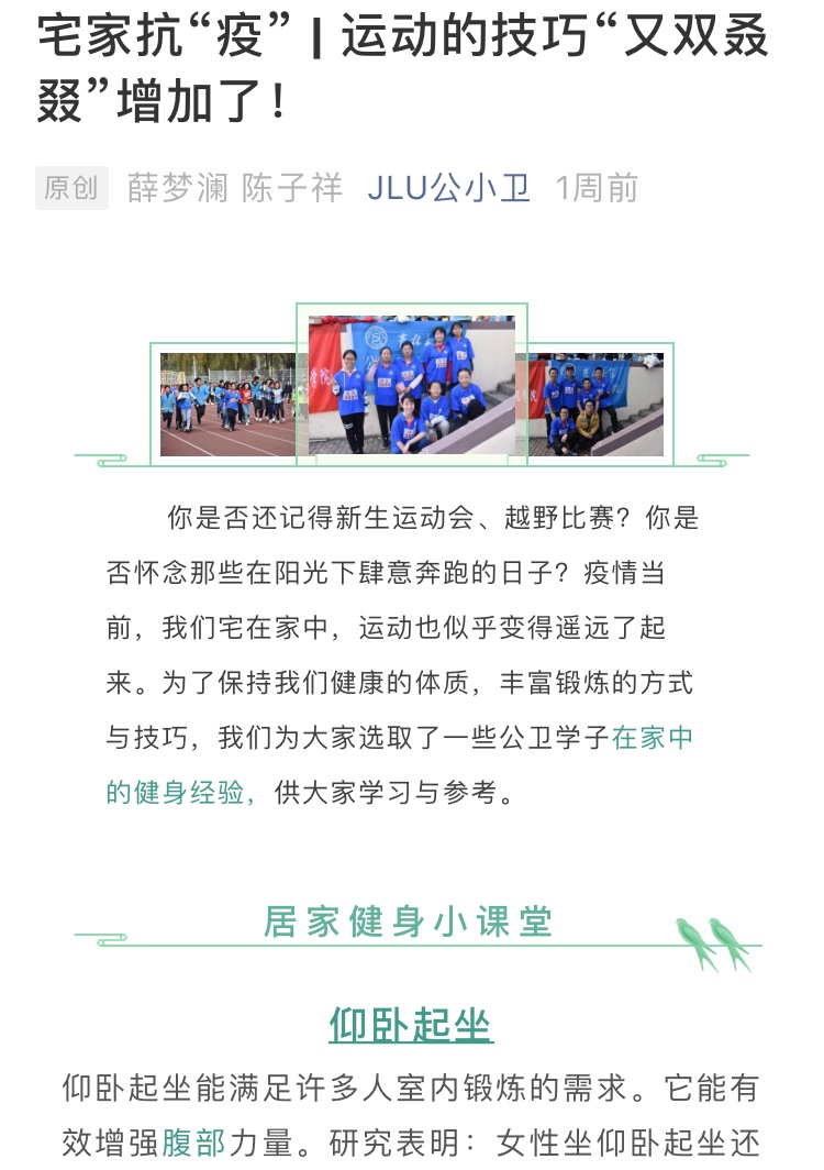学生会体育部面向学院全体本科生开展了以“强身健体,抗击肺炎”为主题的居家健身活动。本次活动不仅以推文、照片和视频方式进行在线健身教学指导,也展现公卫健儿们别样的青春风采。