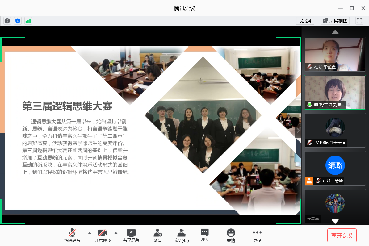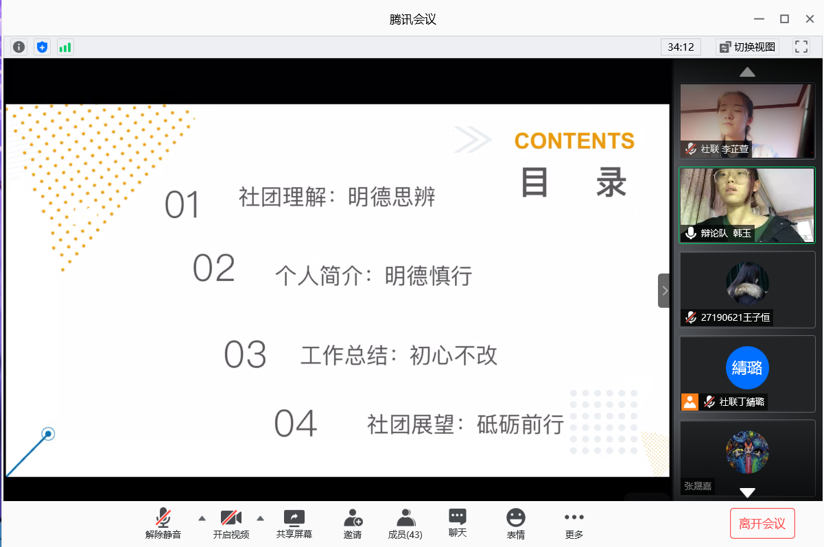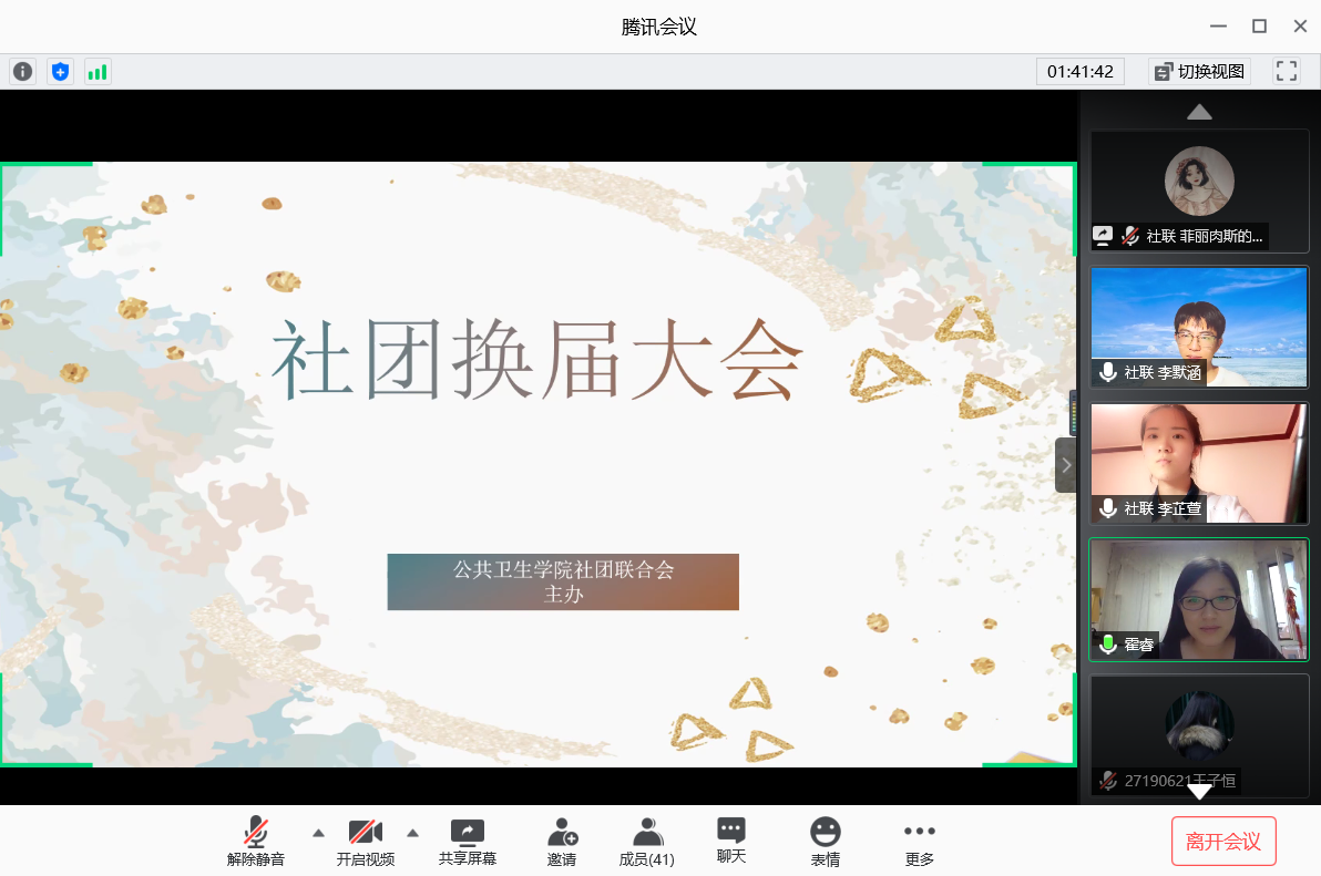 社团换届大会于6月24日晚六点在腾讯会议平台成功举行。2016级辅导员霍睿、2017级辅导员冷贺璇以及第36届团学组织成员出席本次会议。