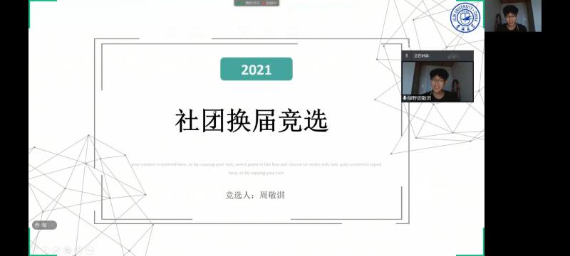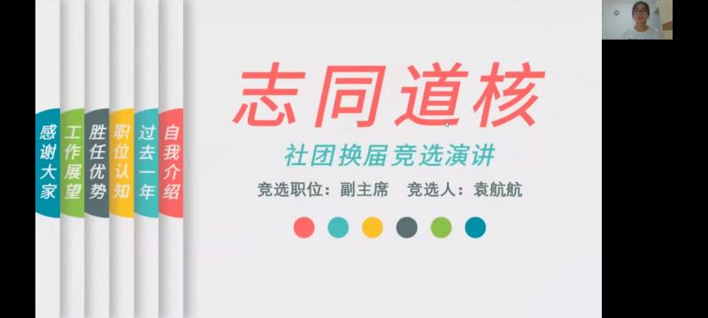 首先,由主持人宋雅萌和张晶介绍到场嘉宾并且介绍竞选规则。随后各个社团主席、队长竞选人员按照先定顺序依次打开屏幕共享配合PPT进行竞职演讲。竞选者们大多从个人简介,工作经历,个人优势和未来展望四个方面展开演讲。每位竞选者的演讲都十分精彩,他们回顾了过去一年在 onejav