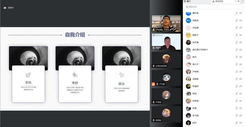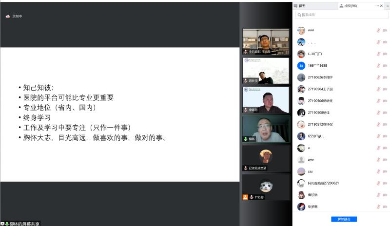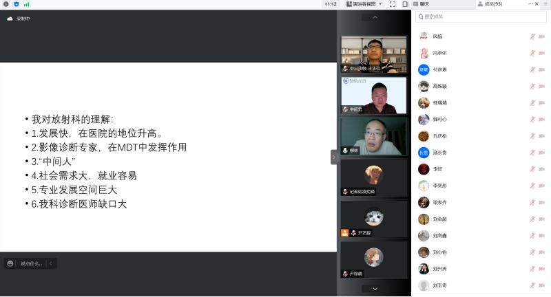 放射医学的发展现状和时代背景下放射医学的就业前景,然后分享自己对于放射专业的看法并且表达对柳教授和王教授的欢迎。而后,特邀嘉宾柳教授进行演讲,柳教授用自己丰富的工作经验向同学们说明医院平台与专业选择的重要性和考虑因素,通过一些实例展示放射科的意义与作用,并且告诫同学们应该保持终身学习的热情和专注。